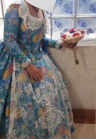Vestido de fallera para adolescente, con un diseño floral vibrante y detalles de encaje. - Mangas largas con puños de encaje. - Escote cuadrado. - Incluye detalles de lazos y manteletas. - Tambien incluye una tela de color verde como los tallos de las flores de largo 1,40 y Ancho 1,60 para hacer otro corpiño. - corpiño de tela para que la falda no descanse en las caderas. ¡Se puede quitar! MEDIDAS: Largo de la falda 100 Largo del corpiño 36 Largo de la manga 63 Ancho del brazo 35