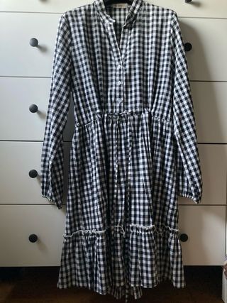Vestido de Zara con estampado de cuadros en tonos azules y blancos. Presenta un diseño con volantes. - Manga larga. - Cuello camisero. - Cierre de botones.