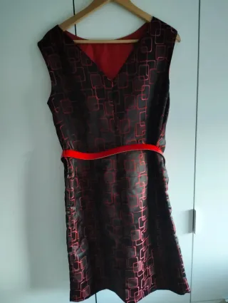 Elegante vestido negro con un llamativo estampado de cuadros en rojo. Cuenta con un cinturón rojo a juego que realza la silueta. - Diseño sin mangas. - Cinturón con lazo. - Forro interior rojo.