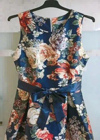 Vestido de fiesta para niña con un diseño floral en la parte superior y una falda voluminosa.Moldelo único hecho a ella,no hay otro igual. - Parte superior con estampado floral. - Manga corta. -Colores champagne,negro y granate - Falda con vuelo. - Cierre de cremallera. Usado en dos eventos.
