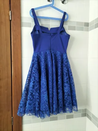 Vestido corto de fiesta con un vibrante color azul intenso. Ideal para eventos especiales. - Diseño con tirantes. - Cuerpo liso. - Falda de encaje floral. - Largo hasta la rodilla.