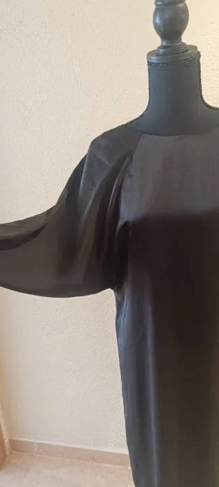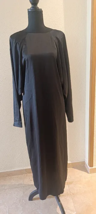 Elegante vestido negro de corte largo, ideal para eventos nocturnos o fiestas. Con manga murciélago - Diseño de manga larga. - Tejido satinado con caída. - Cuello redondo.