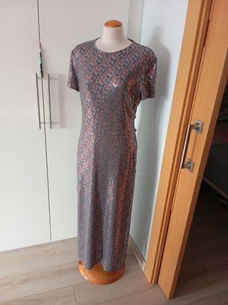 Vestido de fiesta con lentejuelas, cuello caja, sin mangas. Como se puede ver en las fotos le faltan alguna lentejuela aunque no es muy notorio. Corte ajustado. Talla/ XXXS