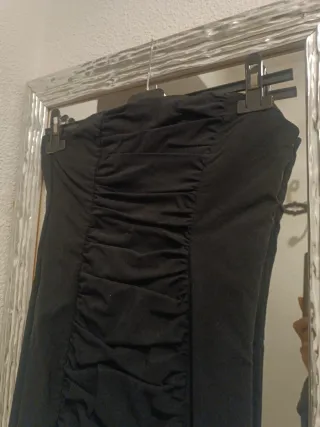 Elegante vestido de fiesta de dos tonos, blanco en la parte superior y negro en la falda. Comprado en El Corte Inglés. - Diseño sin tirantes. - Detalle de lazo en la cintura. - Tejido satinado - Queda muy estilizado