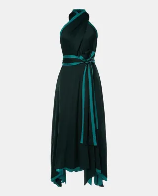 Elegante vestido de fiesta midi con detalles en contraste. - Diseño halter. - Cinturón anudado. - Bajo asimétrico.