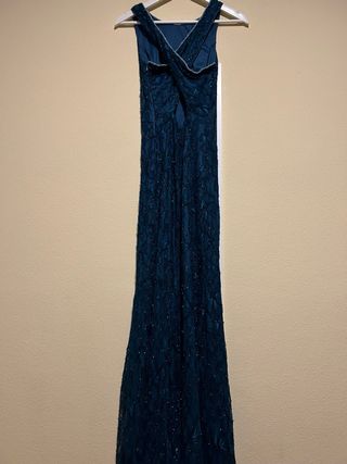 Elegante vestido largo para ocasiones especiales. Su diseño detallado lo hace único. - Color verde azulado. - Adornado con pedrería. Forro elástico interior - Corte largo y estilizado. - Espalda cruzada. Los tirantes en la espalda están unidos pero se pueden soltar - Cremallera lateral Elástico Medidas Sisa 37 cadera 43 Usado solo en una boda