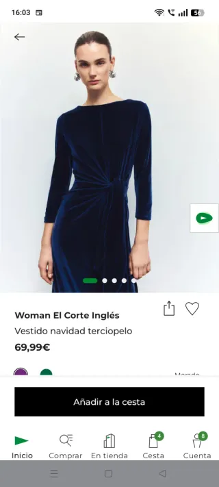 Vestido de terciopelo azul marca Woman El Corte Inglés. Puesto una única vez. En perfectas condiciones. - Talla L, equivale talla 44. - Color azul. - Terciopelo