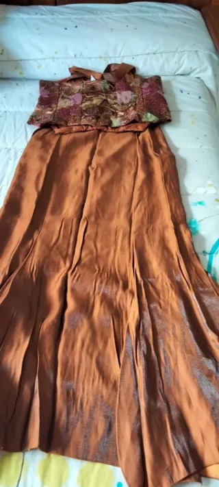 Vestido de fiesta de seda de la marca Mummuy, ideal para embarazadas. Su diseño es elegante y favorecedor. - Tejido con estampado de hojas en tonos dorados y rojizos. - Corte que se adapta a la silueta. - Ideal para eventos especiales. - solo un uso.