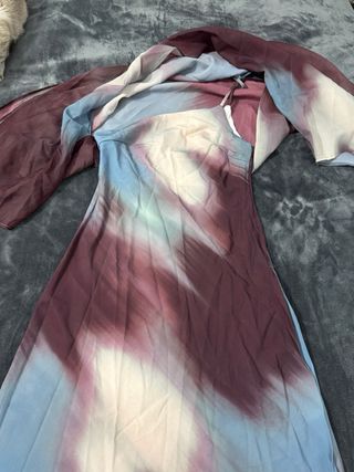 Elegante vestido midi con un estampado abstracto en tonos azules y morados. Su diseño asimétrico y las mangas acampanadas le dan un toque moderno y sofisticado. Talla una S/M - Tejido fluido y ligero. - Corte midi. - Diseño de un solo hombro.