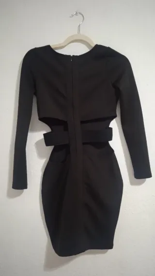 Vestido negro elástico con estampado geométrico, ideal para fiestas. Diseño de manga larga y corte ajustado. Usado una sola vez.