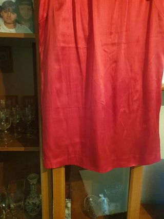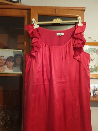 Vestido de fiesta de color rojo, ideal para eventos especiales. - Diseño con volantes en los hombros. - Tejido satinado. - Escote redondo.