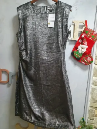 Vestido de fiesta con un acabado plateado brillante. Su diseño es elegante y moderno. - Tejido con textura metalizada. - Tirantes finos. - Corte fluido. NO SE HACE REBAJA, SE PAGA EN MANO Y EN EFECTIVO