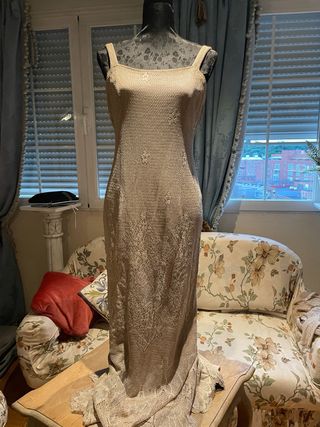 Elegante vestido largo 2 piezas ...de fiesta en color beige. Su diseño es ideal para eventos especiales. - Tejido de punto con detalles de encaje. - Tirantes - Corte recto y largo hasta el suelo. - Adornos florales sutiles en el tejido.