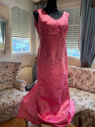 Elegante vestido largo de fiesta con un diseño estilo sirena. - Escote en V. - Adornos florales bordados en plata y seda rosa a mano - Corte que realza la figura. - Tela de raso de sed , con caída. bordado con hilos de plata y seda, natural a mano Solo puesto una vez y fue al tinte
