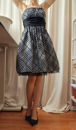 Elegante vestido de fiesta con un diseño llamativo. - Adornado con detalles plateados. - Diseño de tirantes. - Largo hasta la rodilla. usado una vez