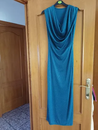 Elegante vestido largo de fiesta con un diseño drapeado en el escote y detalles brillantes.Es verde azulado con brillo. Es muy cómodo.Usado 1 ocasión ( boda). Aprovecha su super precio. - Escote drapeado. - Tejido con pequeños detalles brillantes. - Corte ajustado.