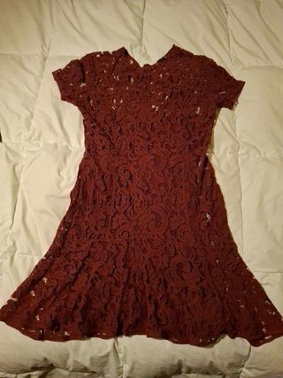 Vestido H&M talla 38 de encaje rojo, con vuelo, con mangas transparentes, vestido con forro. Queda precioso puesto con escote en v. Solo tiene una puesta. Es muy cómodo.