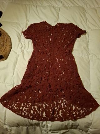 Vestido corto granate oscuro,entallado y vuelo al final. Cierre posterior con cremallera y combinación interior. Usado solo un dia, la combinación interior tiene una tara(foto) pero es interior y no se ve. Para 38 y en 40 queda mas ajustado y muy bonito. Venden el mismo en esta plataforma por 45 euros. Oportunidad