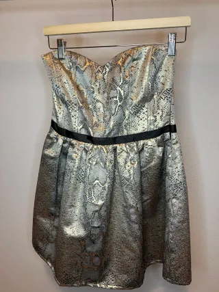 Bonito vestido de fiesta corto, palabra de honor. Brillo plateado en la zona de la falda Cremallera en parte posterior