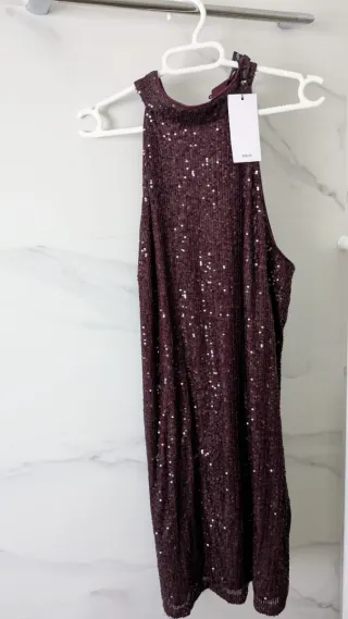 Vestido corto de lentejuelas, entallado y muy favorecedor. Tiene cuello halter, ideal para este tipo de vestido con lentejuelas, ya que estiliza mucho la zona del cuello y los hombros. Es sin mangas y lleva una abertura en la espalda con cierre de botón. Va forrado por dentro, así que no pica y es cómodo de llevar. Lo compré para mí, pero me queda pequeño y cuando fui a devolverlo ya se me había pasado el plazo 😅 Es perfecto para Nochevieja, fiestas o cualquier ocasión especial. Composición: 95% poliéster, 5% elastano. Forro: 100% poliéster. En tienda cuesta 24,99 € y lo vendo por 14,99 €. Nuevo con etiquetas.