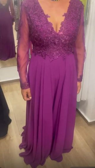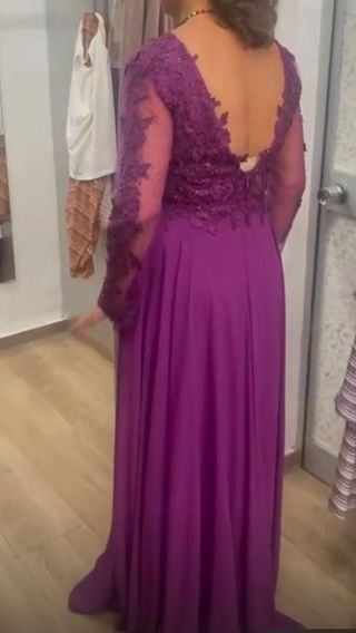 Elegante vestido largo de fiesta en tono morado, ideal para eventos especiales. Presenta un diseño con cuerpo de encaje y manga larga. - Cuerpo de encaje con detalles. - Mangas largas transparentes con puños adornados. - Falda larga y fluida.