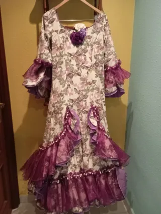 Vestido de sevillanas o flamenco con un estampado floral en tonos morados y beige. Ideal para fiestas o disfraces. - Mangas acampanadas con volantes de tul morado. - Adornos de volantes y pompones blancos en la falda. - Detalle floral en el escote.