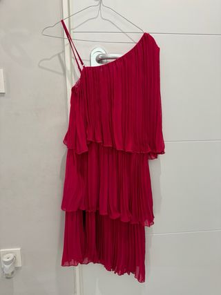 Vestido corto en un fucsia vibrante, con diseño asimétrico: un hombro desnudo y un hombro con volantes. Capa de volantes en cascada que aportan movimiento y un aire festivo y fresco, con una tela suave parecida al satén/seda. Ideal para fiestas, cenas especiales o un look llamativo de verano.
