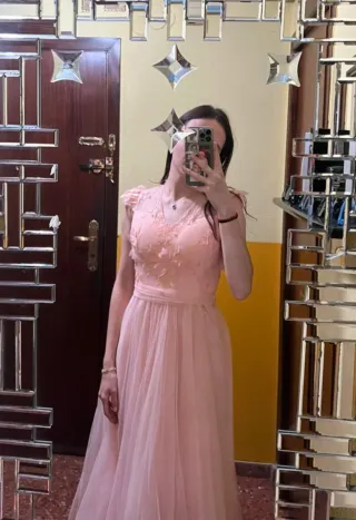 Vestido de invitada ideal para bodas y eventos especiales. Su diseño elegante y el color rosa empolvado lo hacen destacar, tiene la parte derecha abierta para enseñar pierna la parte del pecho viene con relleno para llevar el vestido sin sujetador. Es de tela caída y muy largo ami me arrastraba hasta con los tacones altos. Solo lo e usado una vez que iba de dama. Me costo 160€. La marca es C'Fait Pour Vous (Paris) - Tejido de tul con detalles fruncidos. - Adorno de volantes en el hombro. - Cinturón de tela a juego.