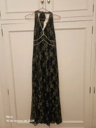 Vestido negro con una sobre tela de poliéster y fibra metálica con un dibujo de flores engarzadas en oro viejo, escote de pico por delante y por detrás, tirantes anchos con adorno de lentejuelas y abalorios bajo el pecho, lleva el mismo adorno a juego con los tirantes, forrado entero, cremallera invisible en el lado izquierdo la medida bajo el pecho es de 35 cm, la parte del pecho da más talla, largo desde el tirante 1,18m,talla S muy elegante,ligero y cómodo solo se ha usado una vez