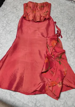 Vestido de fiesta largo con estampado de flores y detalle de lazo rojo bajo el pecho, escote palabra de honor, es muy cómodo y favorecedor. Utilizado en una ocasión.