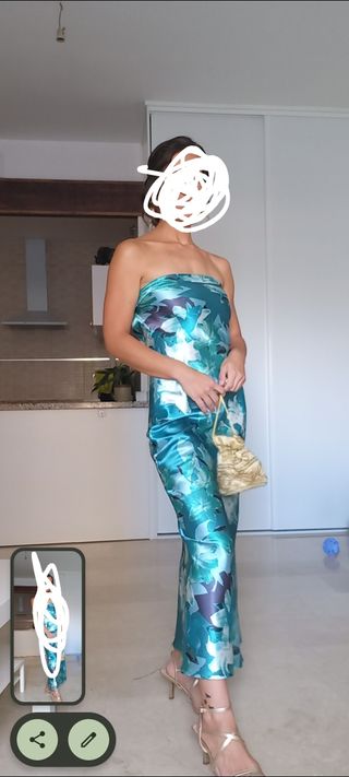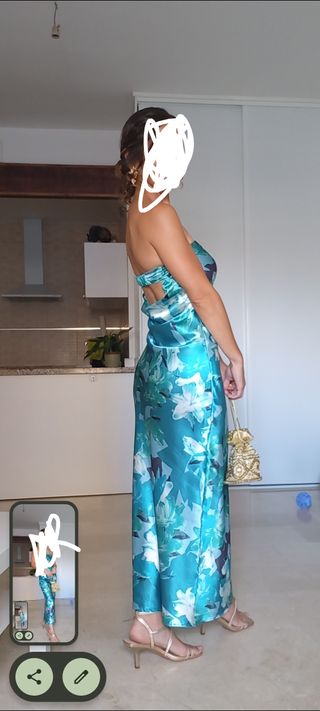 Puesto una sola vez. Precioso vestido de fiesta largo, tipo seda, con estampado de flores en tonos azules y turquesas. Ideal para una ocasión especial. - Escote palabra de honor. - Diseño fluido y elegante. - Caída suave y ligera. - Apertura en la espalda.