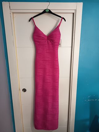 Precioso vestido largo de fiesta, color rosa fucsia. Ideal para una ocasión especial. - Escote asimétrico. - Diseño drapeado en la cintura. - Tejido ligero y fluido. - Falda larga con caída elegante.