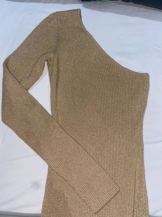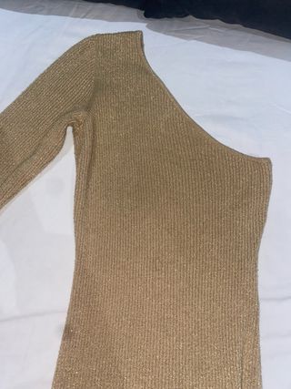 Vestido elegante de un solo hombro con acabado brillante. - Diseño de canalé. - Manga larga. - Tejido con hilo metálico.