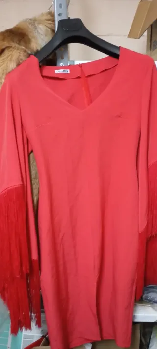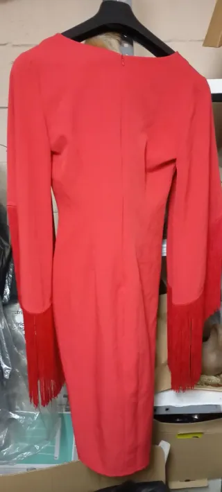 Vestido de fiesta elegante en color rojo, con un diseño moderno y llamativo. - Mangas largas con detalle de flecos. - Escote en V. - Cremallera en la espalda.