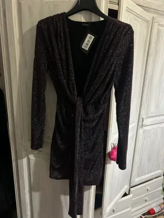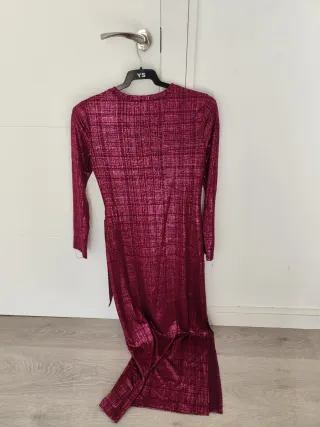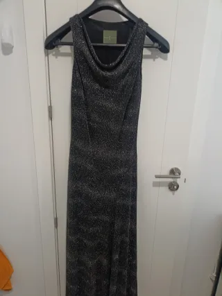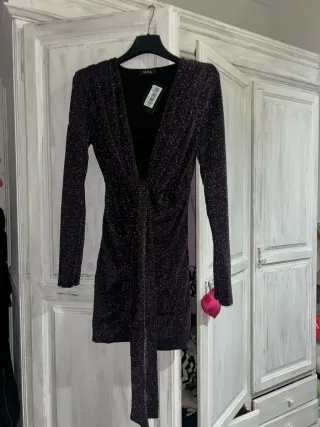 Precioso vestido de fiesta con un acabado brillante. - Diseño con escote pronunciado. - Mangas largas. - Detalle de drapeado en la cintura. - Tejido con destellos. - Nuevo sin estrenar con etiquetas - Costó 24'90e