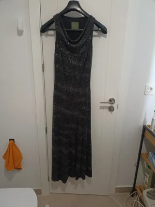 Elegante vestido de fiesta largo con detalles en dorado. - Diseño con escote en V. - Tejido satinado brillante. - Tirantes finos. - Lentejuelas en espalda. - Largo 150 cm. Talla S.