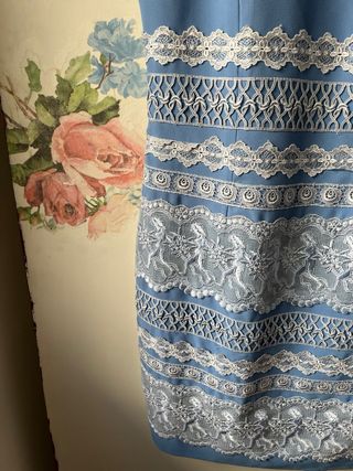 Elegante vestido de fiesta en tono azul, con detalles de encaje. - Mangas cortas. - Diseño con varias bandas de encaje blanco y azul claro. - Largo hasta la rodilla.