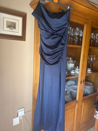 Talla única xs - s .Vestido largo de fiesta en color azul. Queda muy bonito, es ceñido y elegante - Diseño de un solo hombro. - Tejido satinado con drapeado. - Abertura lateral.