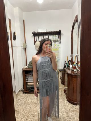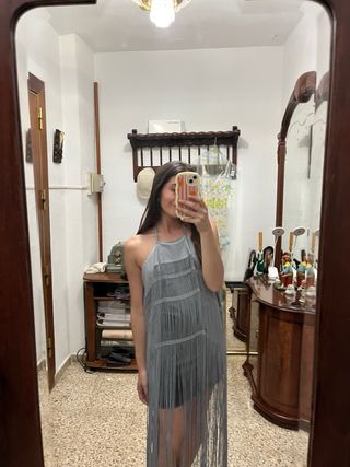Vestido de fiesta con un diseño de flecos muy llamativo. Ideal para eventos especiales. - Diseño con flecos largos. - Corte moderno y elegante.