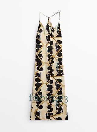 Precioso vestido de fiesta midi con un estampado único. - Diseño con tirantes finos. - Largo midi. - Estampado multicolor sobre fondo beige De sisa a sisa 46cm Largo 115cm