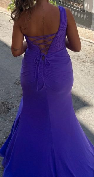 Vestido largo de fiesta en un vibrante tono morado. Su diseño presenta un escote asimétrico y una sensual espalda cruzada con cordones, que se ajusta a la perfección. - Diseño de un solo hombro. - Detalle de fruncido lateral. - Corte sirena. Ahora es más corto, por los tobillos