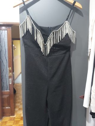 Vestido de fiesta con lentejuelas y flecos. - Diseño con cuello halter. - Detalle de flecos largos en cascada. - Cierre con cremallera oculta.