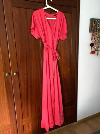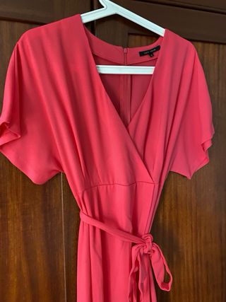 Vestido de fiesta color coral Mango talla S. Es asimétrico, siendo ligeramente más largo por detrás. Escote en V escote y espalda. Tela de gasa vaporosa. Bonita caída y color veraniego. Muy muy cómodo. Tiene unas tiras en la parte de la espalda para enganchar el sujetador y que no se vea. Usado 3 veces.