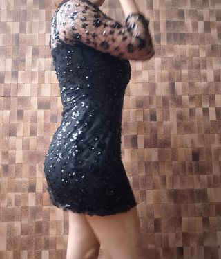 Vestido corto con manga larga de tul transparente. Capa externa de tul con lentejuelas haciendo figuras de flores. No lleva cremalleras. Botón en la parte posterior del cuello. Queda súper elegante. Talla M. Nuevo con etiquetas. HAGO ENVÍOS A PENÍNSULA (escribir por privado).