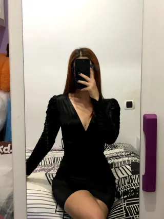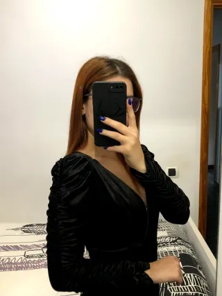 Elegante vestido de color negro, ideal para fiestas, fin de año, cenas... - Diseño con escote en pico. - Mangas largas abullonadas. - Tejido de terciopelo. Importante! yo mido 1.66 y me queda tirando a corto, a tener en cuenta por si mides más que yo, te quedaría como un vestido con mini falda.