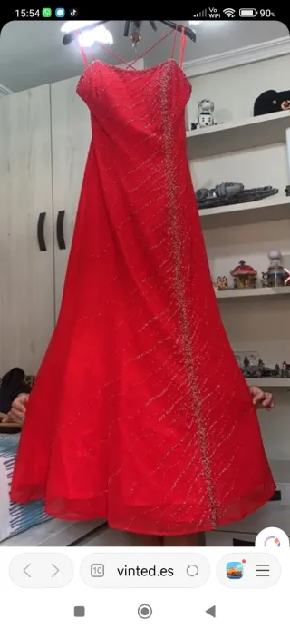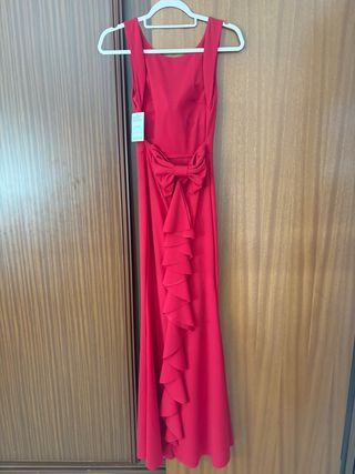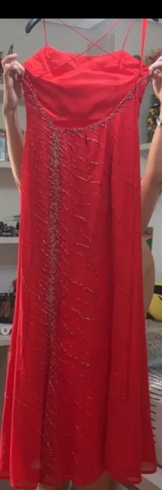 Elegante vestido largo de fiesta en color rojo. - Diseño con tirantes finos. - Escote pronunciado en V. - Falda fluida y vaporosa. - De largo es 163cm. - Detalle de volantes en los hombros. - Es de Boutique nos costó 100€ pero al final no me lo puse..
