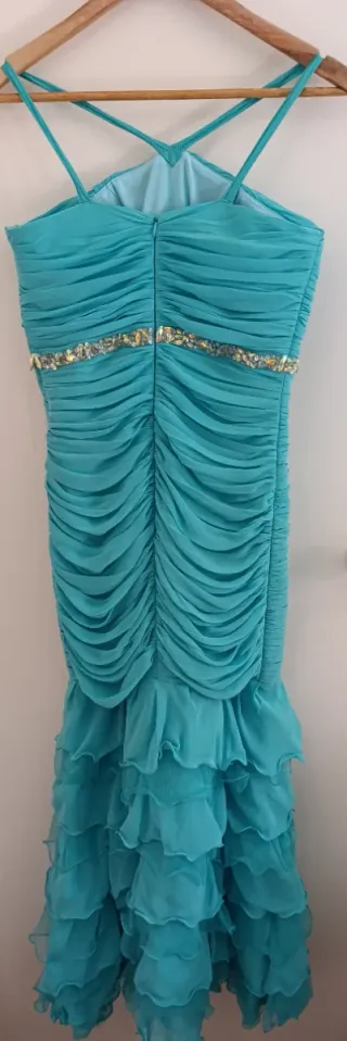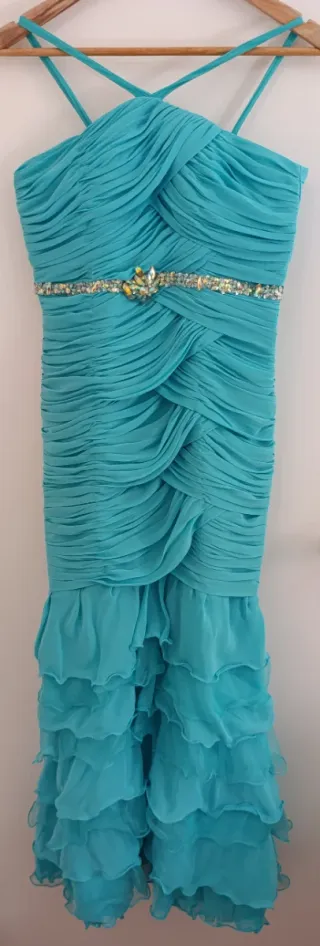 Elegante vestido largo para fiestas en color aguamarina.. Presenta un diseño drapeado y detalles brillantes. La etiqueta pone que es una talla 40 pero da menos talla, las medidas son: de axila a axila 41 cm. Largo 123 cm. Cadera 46 cm. - Escote cruzado. - Cinturón adornado con pedrería. - Falda con volantes. - Tirantes finos.