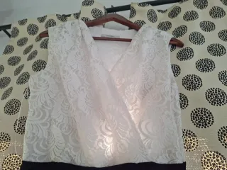 Elegante vestido de fiesta de El Corte Inglés, perfecto para eventos especiales. - Diseño de dos piezas: cuerpo blanco de encaje y falda larga negra. - Corte cruzado en la parte superior. - Cintura marcada.