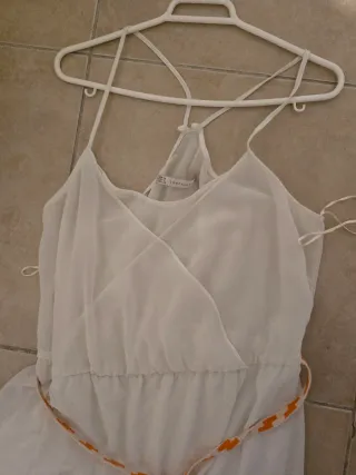 Vestido de palabra de honor, lleva un lazo que se ata atrás. Es talla única (pero sería como una S, sobre todo por la zona del pecho) Súper bonito, es más largo de detrás que de delante. usado 1 vez Para celebraciones, fiesta etc