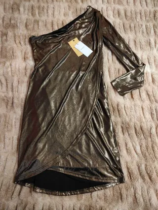 Vestido de fiesta de una sola manga. Escote asimétrico. Color bronce/dorado metalizado con forro interior en color negro. En la parte delantera tiene como doble tela haciendo tipo capa. Tejido elástico. Un poco más largo por detrás. Nuevo. Medidas en las fotos.